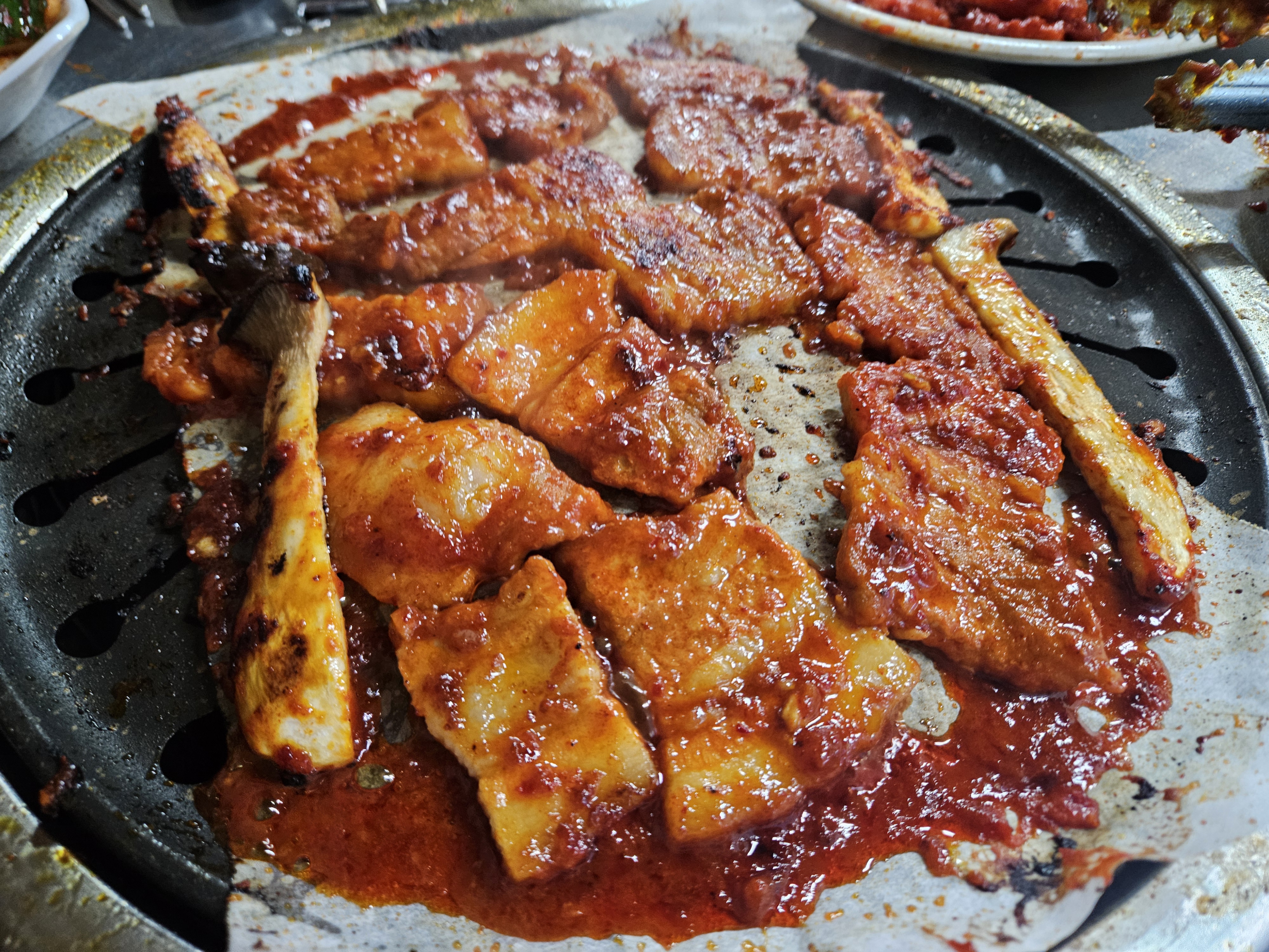 기름종이를 깔고 고추장 삼겹살을 하나둘 구워먹으면 됩니다.
