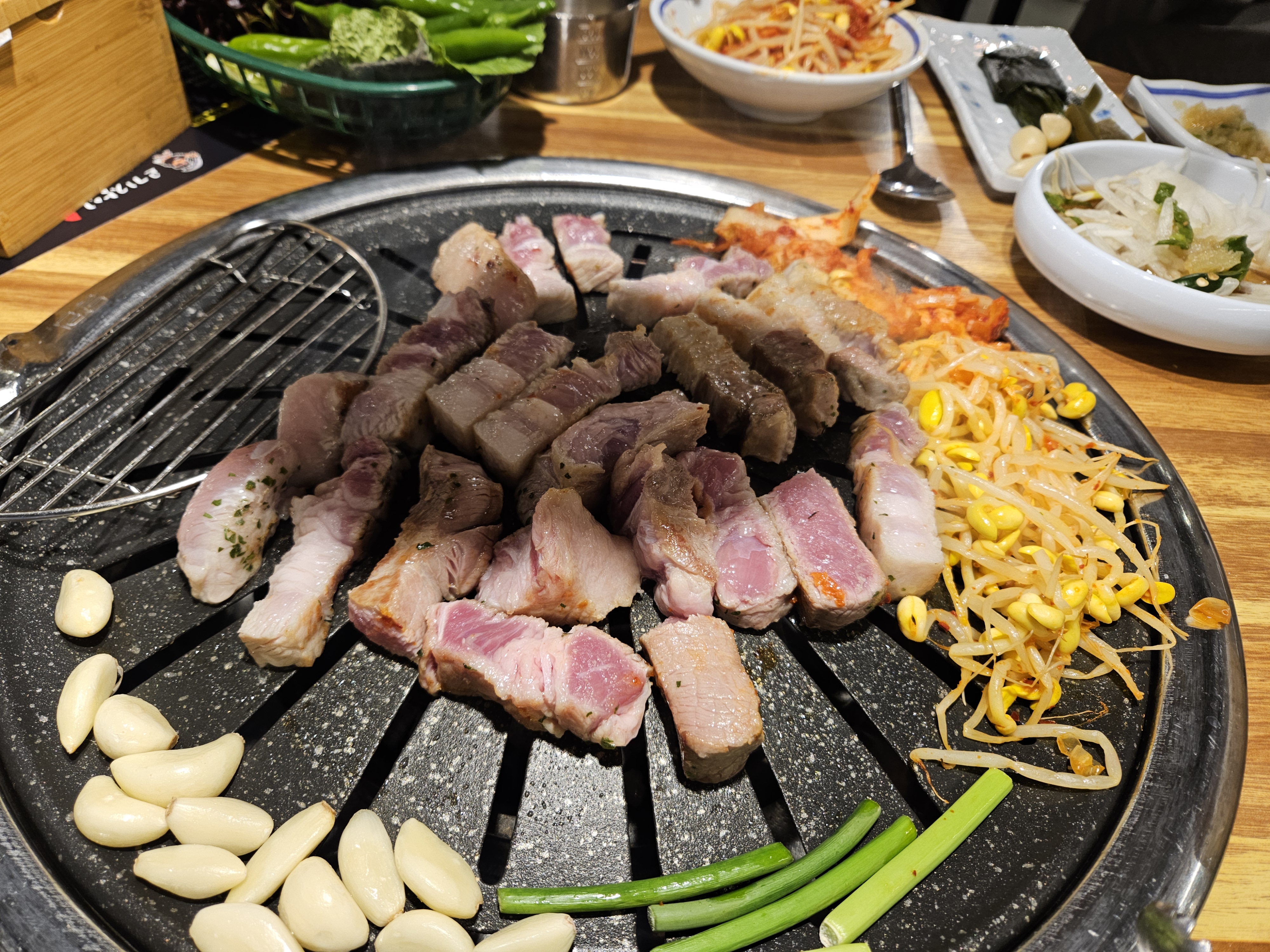 목살과 삼겹 섞어서 5인분을 시켰는데요. 고기 때깔좋죠?